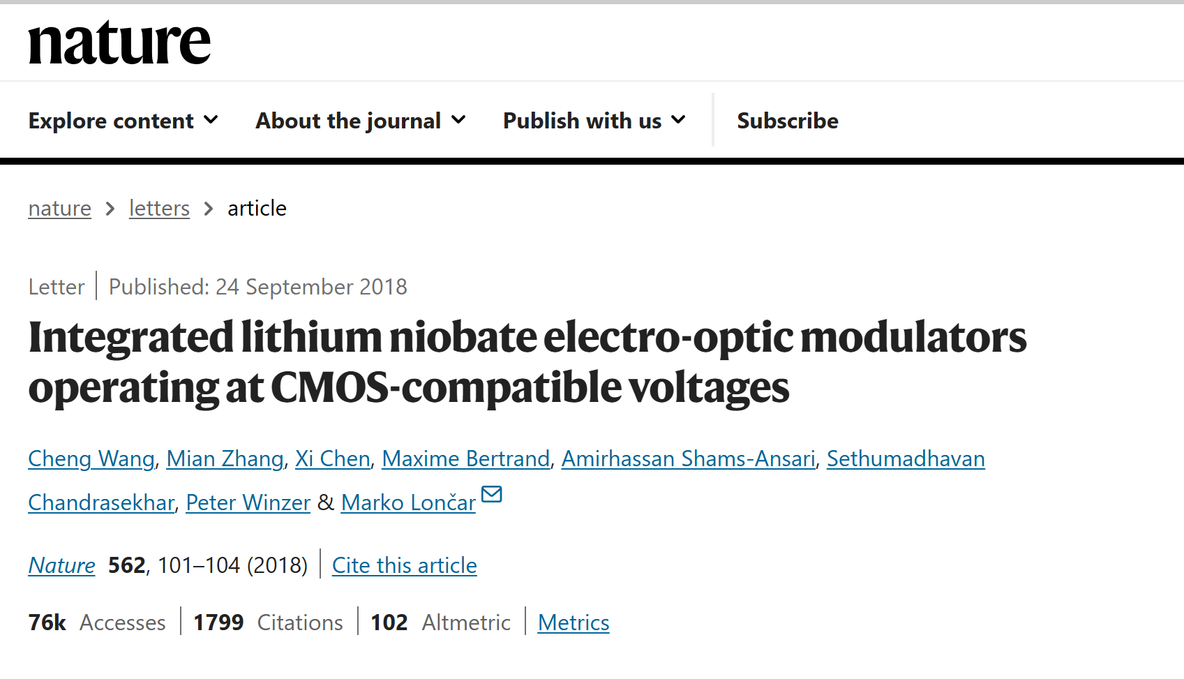 The first demonstration of a CMOS-compatible thin-film lithium niobate modulator with bandwidth up to 100 GHz was achieved, which was published in Nature with Professor WANG Cheng as the first author.