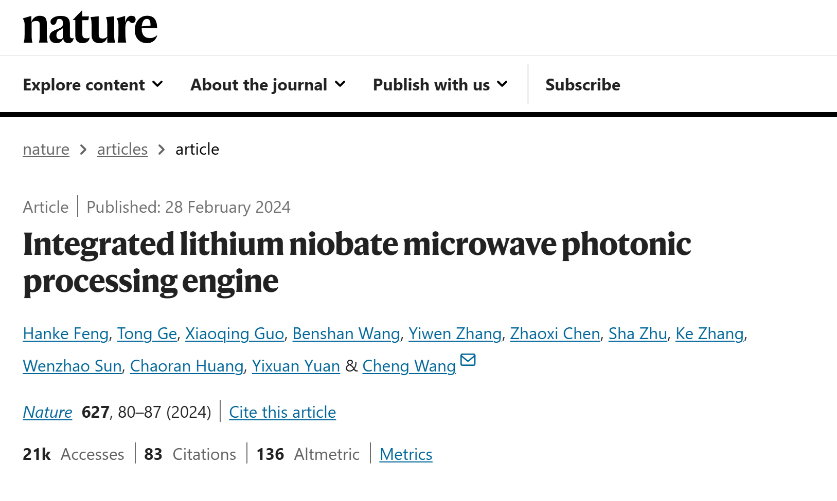 The first demonstration of the integrated thin-film lithium niobate microwave photonic processing engine chip was achieved. This work was published in Nature with Professor FENG Hanke as the first author and Professor WANG Cheng as the corresponding author.