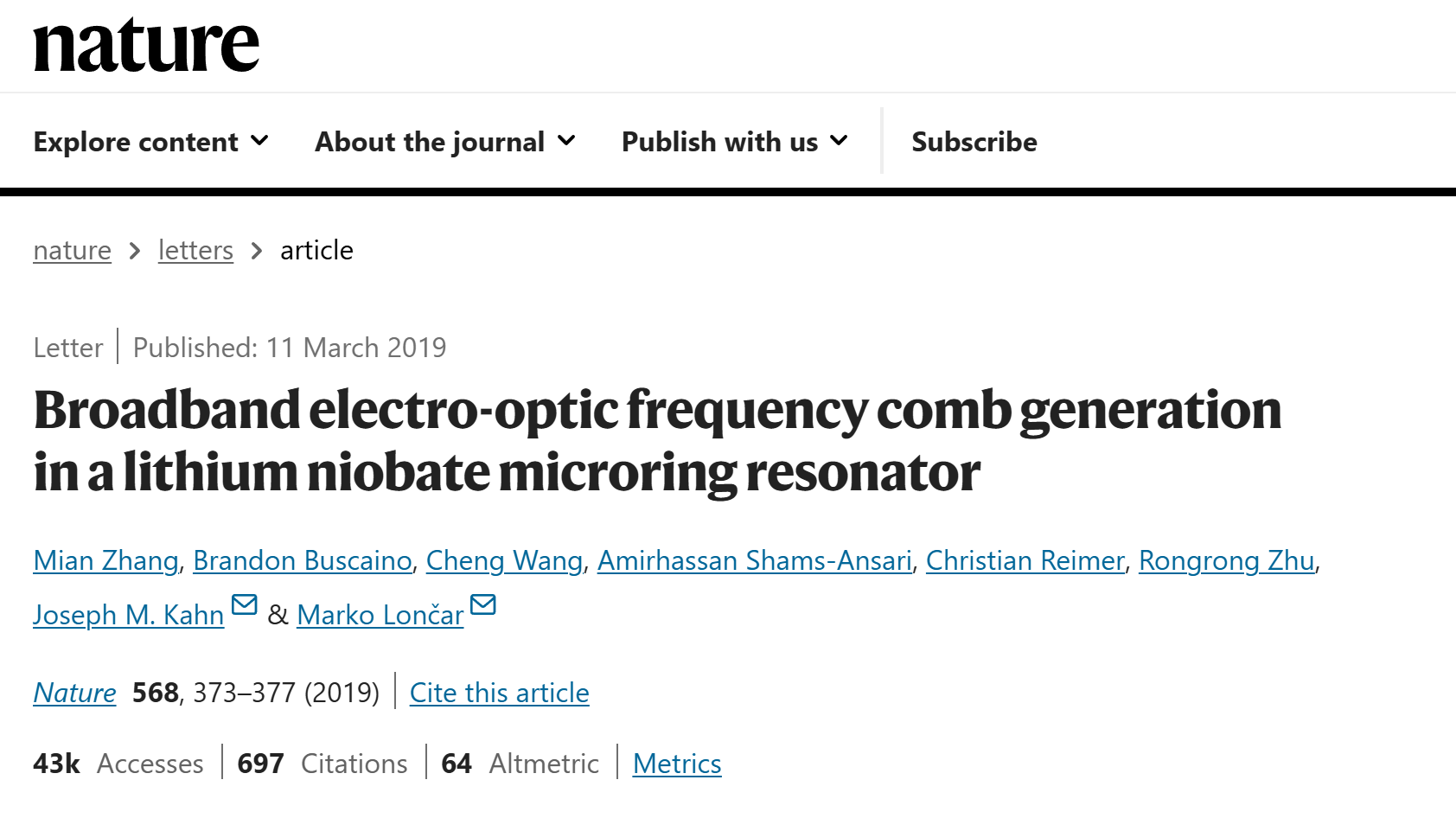 The first demonstration of electro-optic frequency comb generation in thin-film lithium niobate resonators was achieved. The work was published in Nature with Professor WANG Cheng as a co-first author.