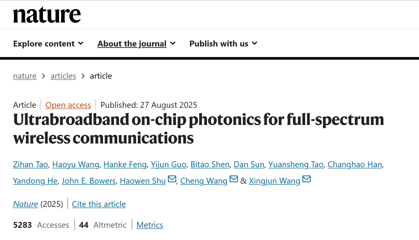 The first demonstration of the full-spectrum 6G wireless communication chip was achieved. This work was published in Nature with Professor FENG Hanke as the co-first author and Professor WANG Cheng as the corresponding author.